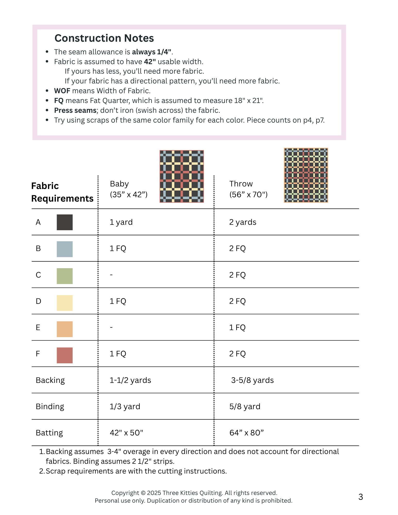 As a bonus, you'll get not one but two patterns - the Junie Quilt and the Reverse Junie! Swapping the background and the colors creates a fun lattice pattern. Either pattern can be made with scraps - use the same color family for each color listed - and piece counts are provided. There are also cutting diagrams where FQs may be used in the Junie baby size or either size of Reverse Junie. Fabric requirements are in the photos.